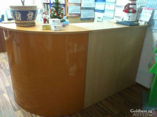 Продам срочно ресепшен б/у, ширина – 205 см. Внутри в круглой части расположены три полки. Прилагается тумбочка на три ящика с замком и стол.